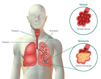 La neumonía (o pulmonía) es una infección de los pulmones provocada por distintos gérmenes como bacterias, virus y hongos que propagan sus microorganismos por el interior de los alvéolos (las ramificaciones en las que se realiza el intercambio de oxígeno entre el aire inspirado y la sangre dentro de los pulmones), a través de la nariz, la faringe o por vía sanguínea.